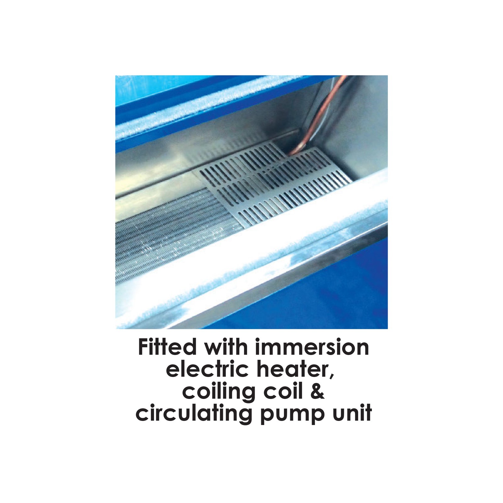 - Fitted with an immersion electric heater, coiling coil & circulating pump unit.